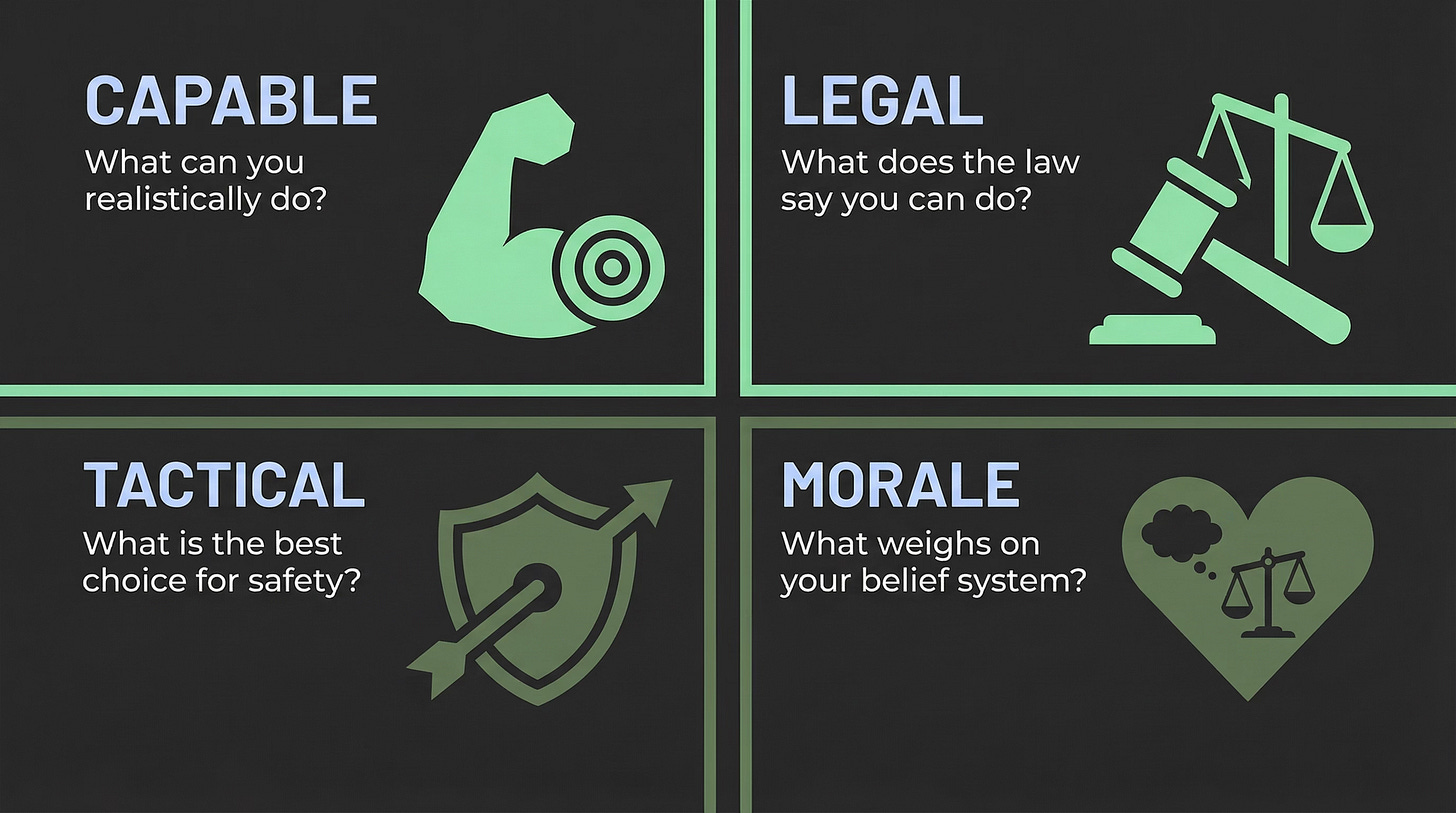 I call this the Capability Assessment: Before you act, ask yourself what you actually hope to achieve with your physical resistance, and whether you’re capable of achieving it.